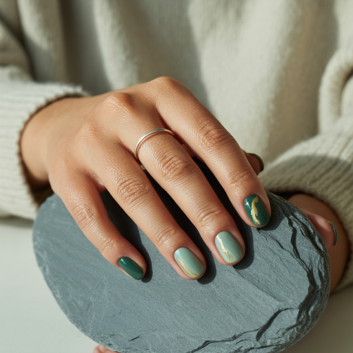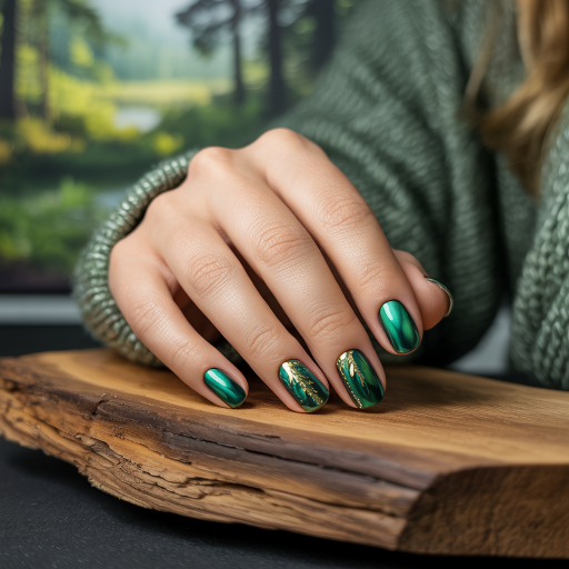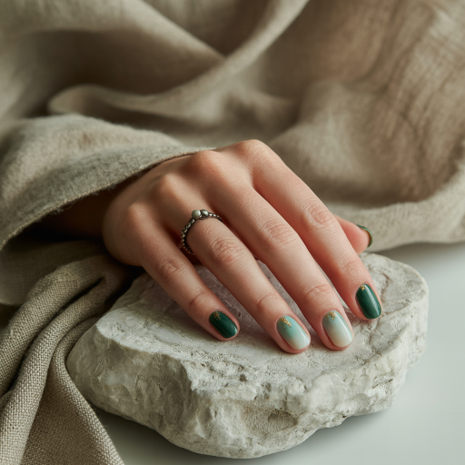 This design features varying shades of green, mimicking the lush surroundings of a lake. From deep forest green to light, minty shades, the gradient effect brings the serenity of nature to your nails. A subtle touch of gold or silver accentuates the rich tones, offering a balance of luxury and nature-inspired beauty.