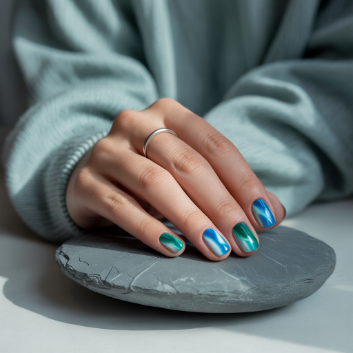 This design features reflective lake-inspired nails with a smooth gradient effect. Soft blues and greens blend together, mimicking the way a tranquil lake mirrors the sky. With subtle shimmer, this look creates a peaceful, serene vibe, making it perfect for those who love nature and the calmness it brings.