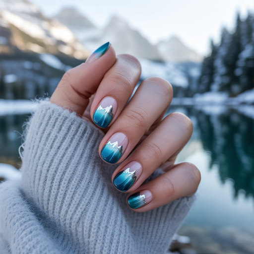 This winter-inspired lake design features soft blue shades for the water, paired with white for snow-capped mountains in the background. A touch of shimmer reflects the icy elements of the scene. Ideal for the winter months, this design brings a cool, crisp aesthetic to your nails while channeling the beauty of lakeside views.