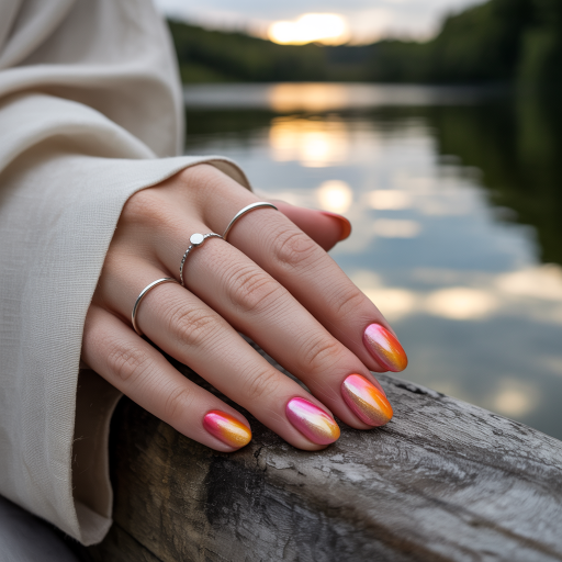 This nail design captures the beauty of a lake at sunset, with shades of warm orange, pink, and gold reflecting off the water. The gradient transition of colors adds depth and dimension to the nails, making this style perfect for those who love the beauty of golden hour. It’s vibrant, yet peaceful—a perfect summer look.