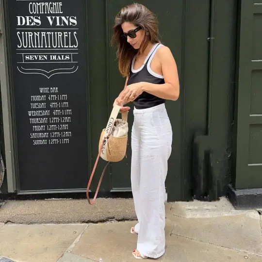 Black tank tops have a way of making everything look cooler, don’t they? Pairing one with linen pants is an easy way to channel that relaxed, yet stylish, vibe. The deep black contrasts beautifully with the light linen, making it an effortlessly chic combination. Perfect for beach days, casual lunches, or just running around town, this outfit is easy, stylish, and comfy.
