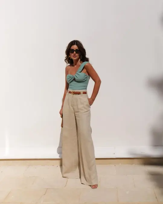 Want to spice things up? A one-shoulder top paired with linen pants brings some serious drama to the mix. The asymmetry of the top adds a touch of elegance and intrigue, while the linen keeps it light and breathable. This pairing is perfect for date nights, dinners out, or whenever you feel like making a stylish statement without overdoing it.
