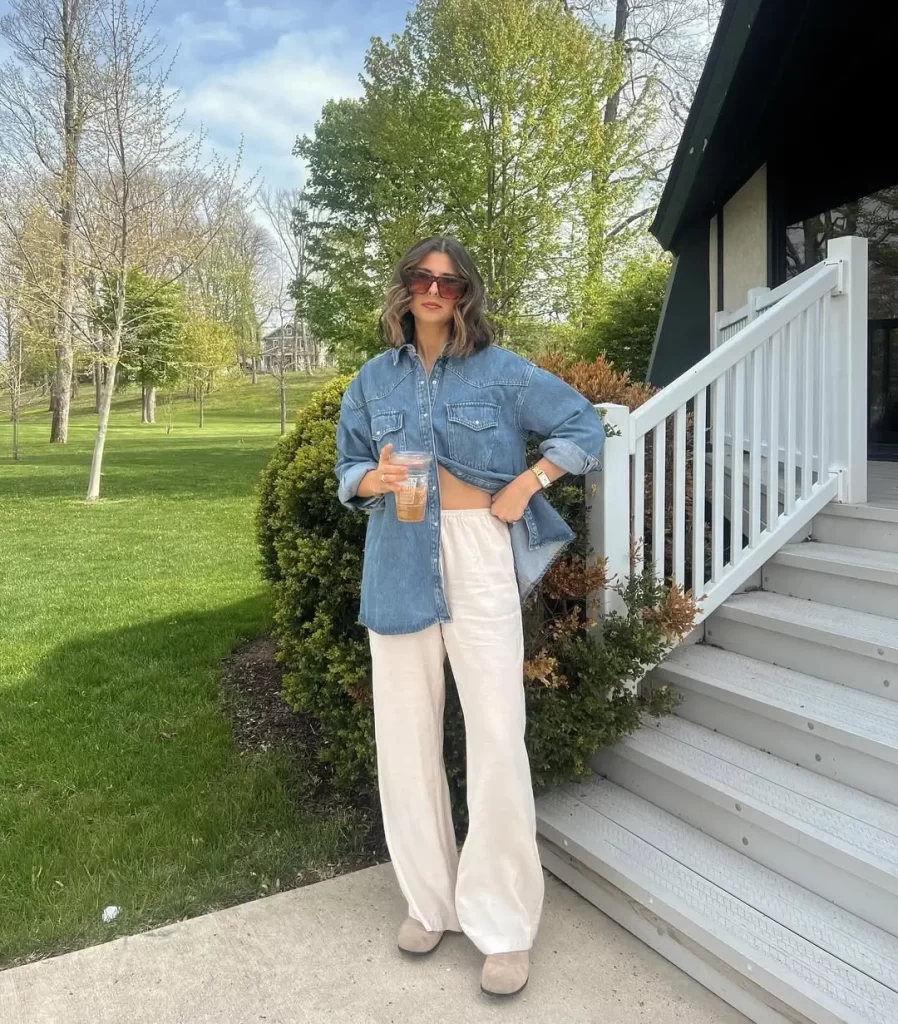 A denim shirt adds instant cool vibes to your linen pants outfit. Denim feels stronger and heavier, which goes nicely with soft linen. You can tuck the shirt in, tie it at your waist, or leave it open with a tank top under it. Add sneakers or slides, and you’ll have an outfit that looks stylish without even trying.