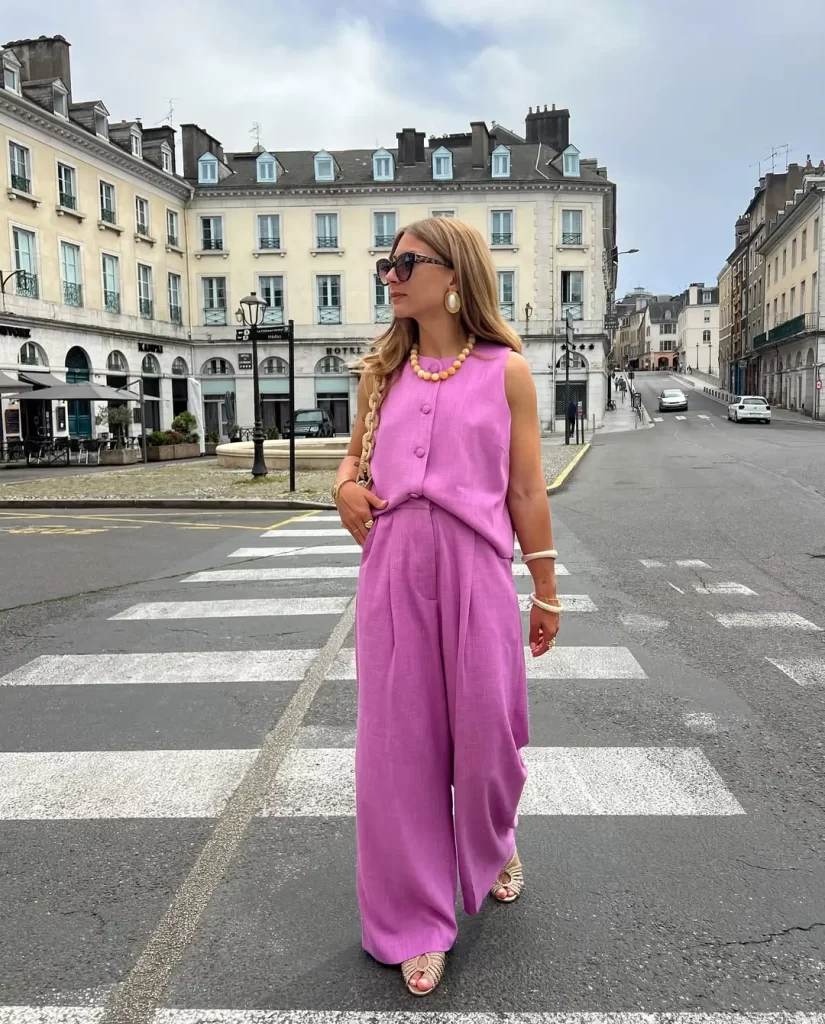 If you want to look more polished, try a matching vest and pants set. This makes your linen pants outfit look like a smart suit, but still feels relaxed because it’s linen. Add heels and gold jewelry if you want to dress it up, or wear flat sandals for a more casual but chic look. It’s perfect for work or brunch.