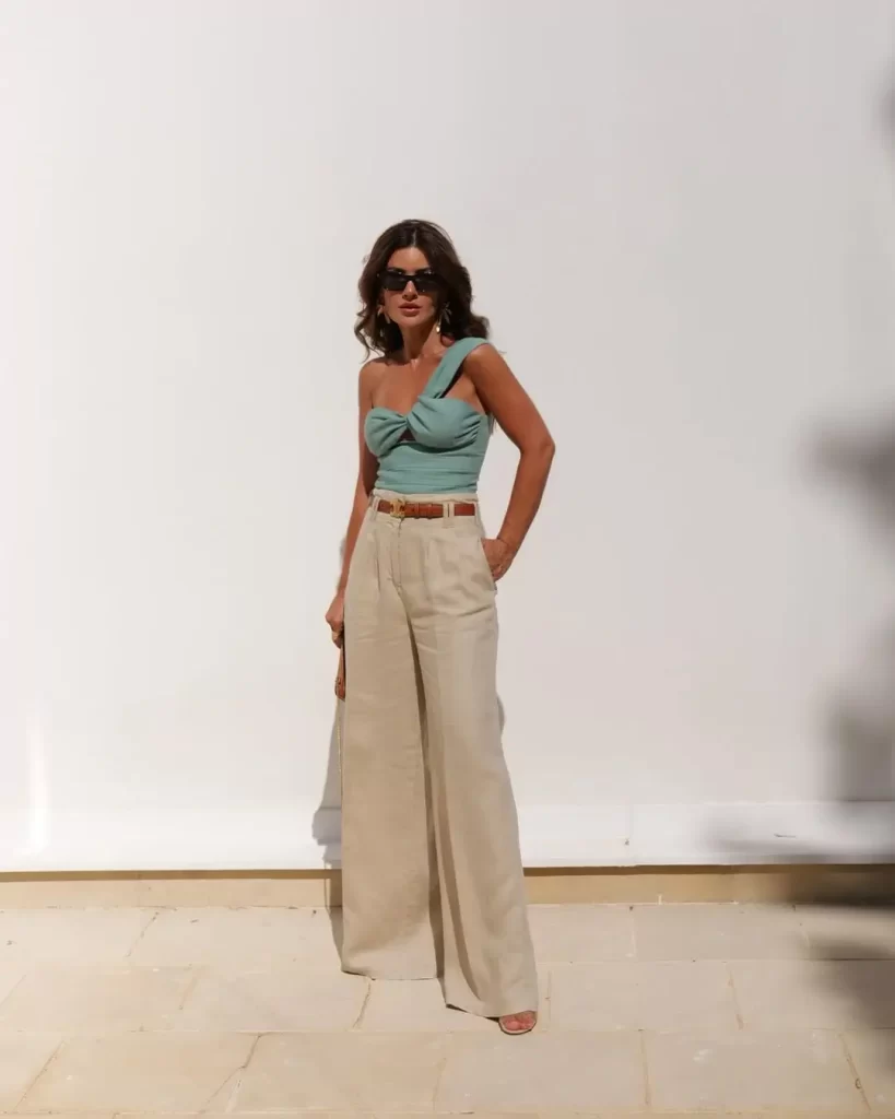 A one-shoulder top adds a little drama to your linen pants outfit. This style is fun, modern, and works great for evenings or special outings. Add big earrings and heeled sandals to finish the look. It’s simple but makes a strong fashion statement without being too much.