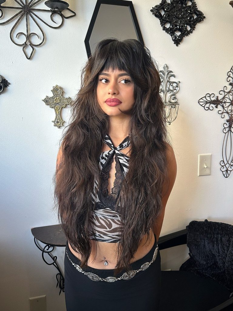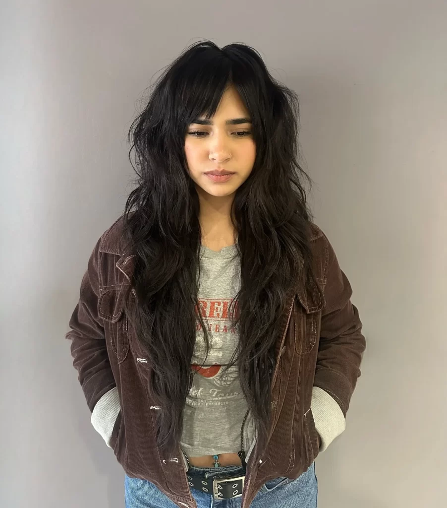 This one feels dreamy. You get the length, the waves, and bangs that don’t make you look like you cut them in the dark. Rounded bangs soften your features, and the long layers add movement so your hair never looks heavy.