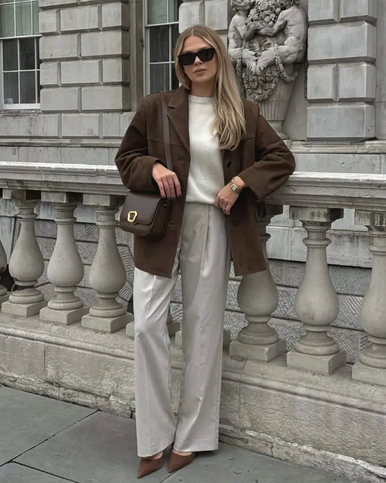 Choose a suede blazer in taupe, mushroom, or sand. Layer it over a tee, silk blouse, or fine gauge knit to lift simple pieces. Carry a structured bag and keep jewelry small so the texture stays the focus. If care is a concern, choose treated suede or a high quality matte faux suede. You will keep the Old Money Fall Style mood with far less fuss.
