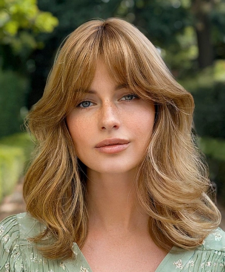 Short layers bring energy. Curtain bangs add balance. Blow-dry with a small brush so the bangs fall apart slightly. A touch of mousse keeps them awake. It’s a soft-spoken style that carries old money grace with modern breath.