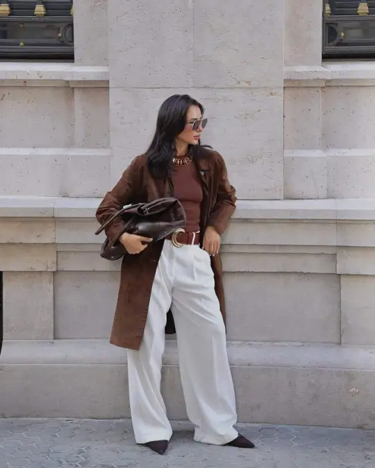 Dark brown can feel heavy on its own. Put it next to light oatmeal, ivory, or stone and it turns warm and elegant. Think espresso sweater with cream pants or a camel coat over an ivory base layer. Add a brown belt and a matching bag so the outfit feels connected. This simple color blend is an easy win when you want quiet luxury with zero fuss.