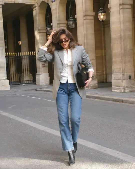 Jeans can look refined when you pick the right partners. Choose straight or slightly wide jeans in a dark or classic blue wash with a clean hem. Add a mid gray blazer in flannel or hopsack, then a tee or a fine knit. Slip on loafers or ankle boots. The gray cools the blue and the whole outfit reads polished without trying too hard.