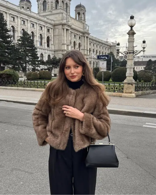 Evenings call for a little drama, not a lot. A cropped faux fur jacket or a vintage stole in brown or champagne over a simple dress or silk blouse adds warmth and ceremony. Keep makeup soft and jewelry minimal so the texture remains the star. Choosing faux or pre loved pieces also shows thoughtful spending which fits the values behind Old Money Style.