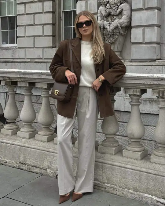 Suede has a soft, matte finish that looks rich in person and on camera. Pair a cropped or hip length suede jacket with wide leg trousers so the outfit feels balanced. Go for chocolate, tan, or olive on top and keep the pants light. A slim belt and loafers finish the look. No logos needed. The texture mix is the message which is exactly how Old Money Style works.