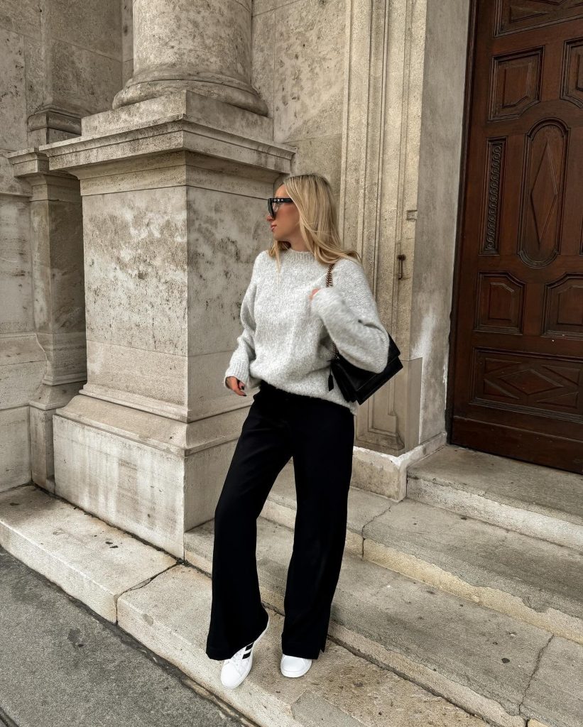 Layer different textures like knits, coats, or trousers to keep it interesting. Sneakers blend in smoothly and keep the look comfortable all day.