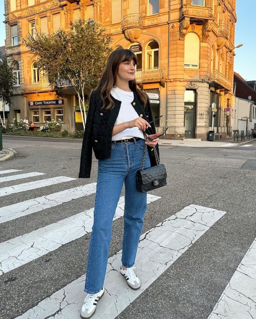 French inspired outfits with sneakers feel effortless in the best way. I love pairing denim with a tweed jacket, a basic tee, and simple sneakers.