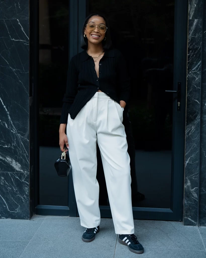 Soft neutral outfits with sneakers feel calm and expensive, even if they’re not. Think cream pants, a simple knit top, and sleek sneakers.
