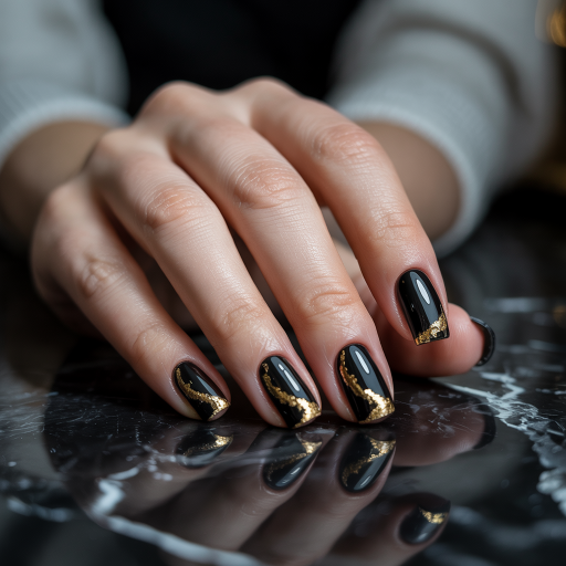 For a striking and dramatic design, black nails with gold foil accents create a luxe, modern look that is perfect for prom. The gold foil adds dimension and elegance to the dark base, creating a look that is both bold and sophisticated. This design can complement a variety of prom dresses, particularly those with metallic or dark tones, for an unforgettable look.
