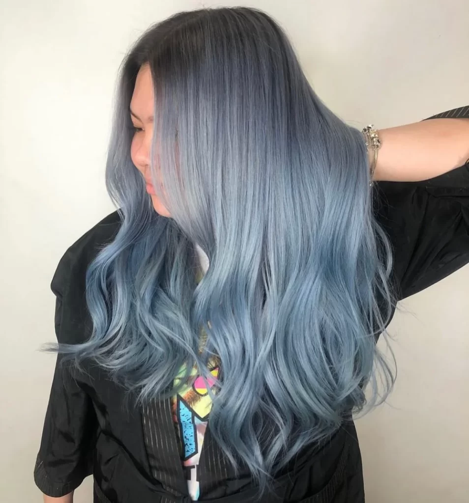 Soft Powder Blue Waves with Smoky Blue Hair Color Framing