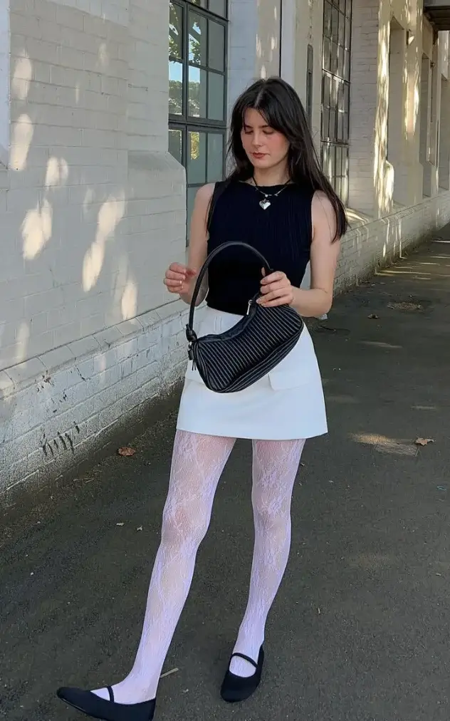 If it’s a bit chilly outside, you can still wear your white skirt by adding patterned tights. You can choose tights that have cool designs like stripes, dots, or flowers. Pair it with a cozy sweater or jacket, and you’ll be both warm and stylish. This way, you can wear your favorite skirt even on cooler days.