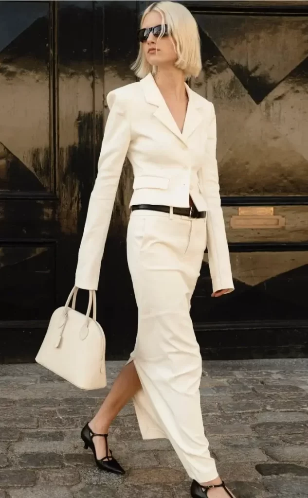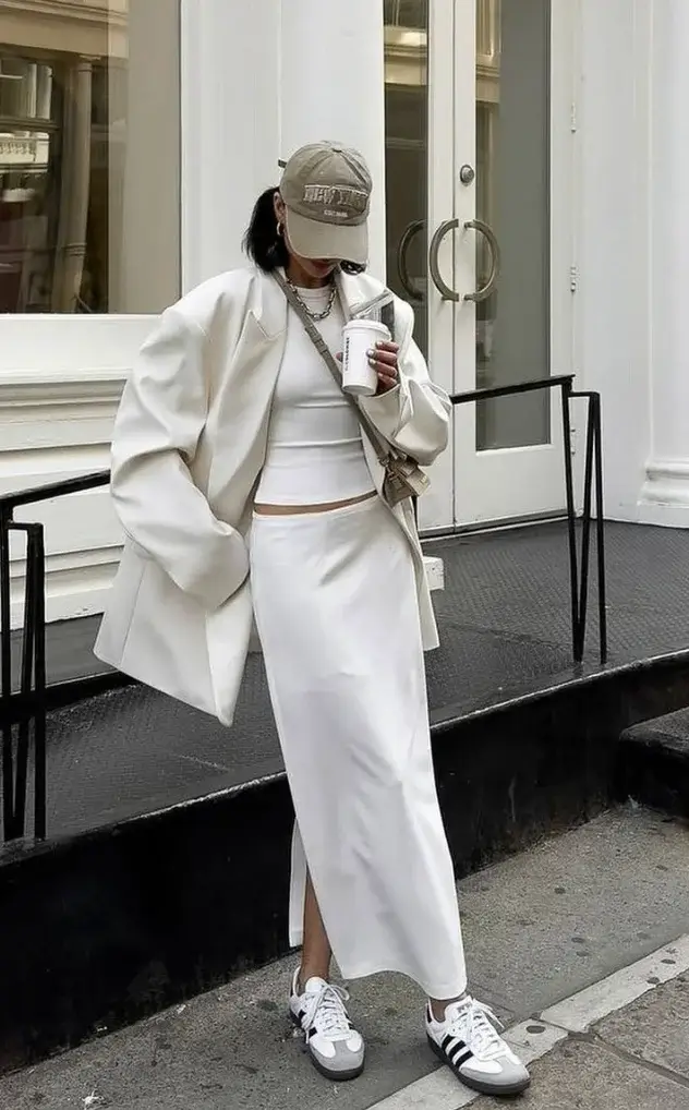 Want to look cool and trendy? Try pairing a white skirt with street-style clothes like a graphic t-shirt or a hoodie. Add sneakers or high-top shoes for a bold, stylish look. The white skirt adds a feminine touch to the cool streetwear, creating a fun and fashionable combination.