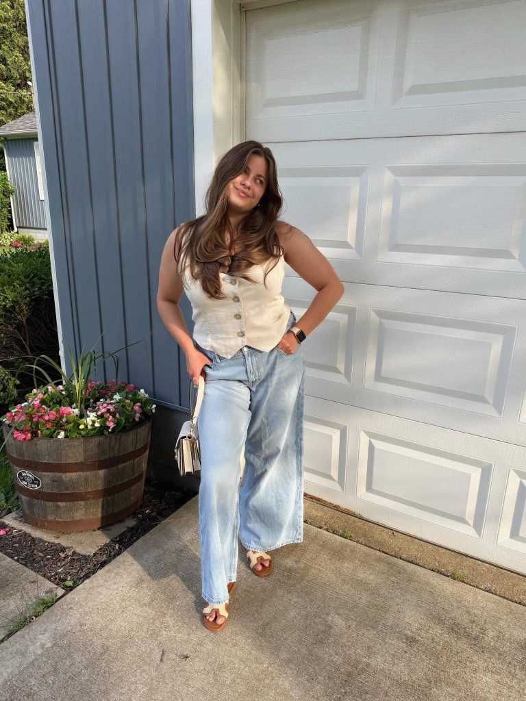 This one blends business casual with vacation energy. An ivory buttoned vest on top and wide-leg denim on bottom creates a sleek, breathable silhouette.