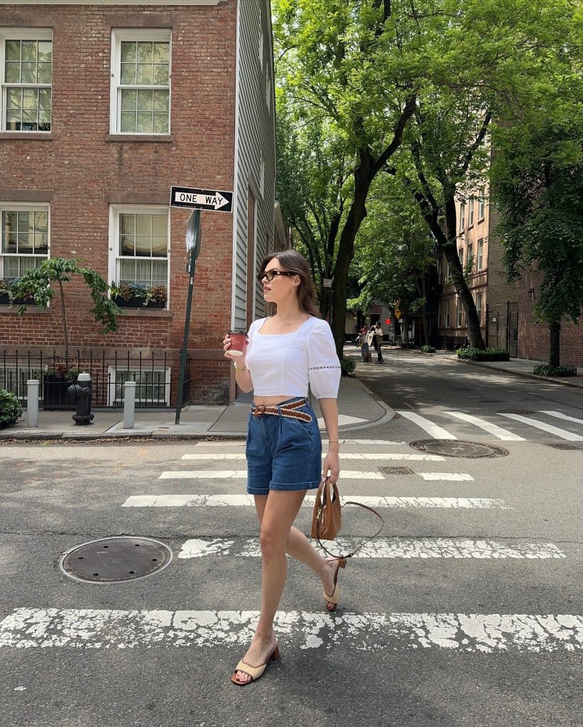 This pairing is peak summer. A square-neck tank feels structured and modern, while denim shorts keep the whole thing grounded.
