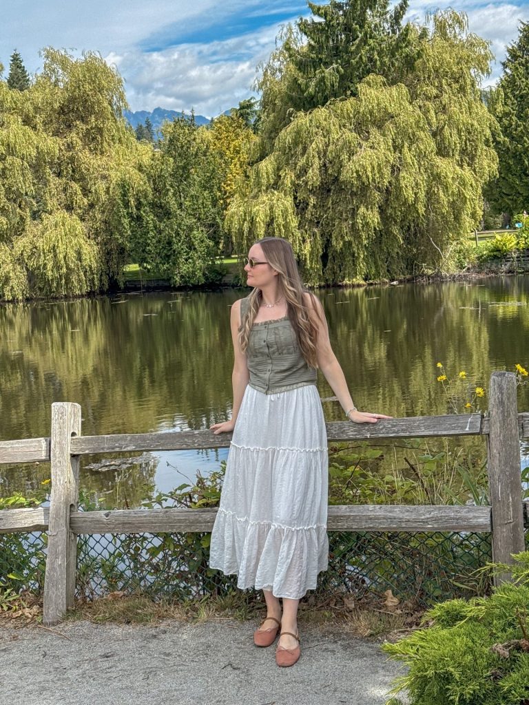 I love this outfit because it mixes structure with flow. The olive corset-style tank shapes the top half while the tiered white skirt twirls around like you’re in a yogurt commercial.