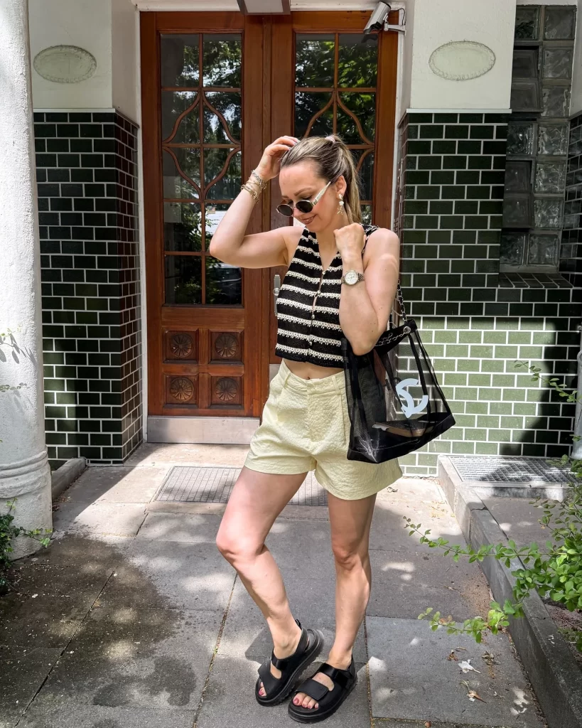 Crochet tops have become a warm-weather staple. They add personality without overheating you (mostly). When paired with textured shorts, the whole look leans “resort casual” in the best way.
