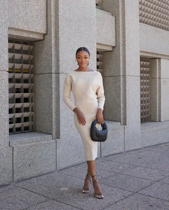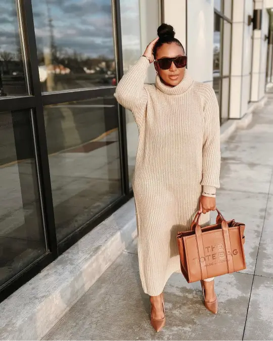 There’s something about a sleek, neutral-toned sweater dress that just looks expensive — even if it wasn’t. Pair it with strappy heels or boots, a cute clutch, and soft glam makeup, and you’re ready for any type of gathering. It’s one of those Thanksgiving outfit ideas that feels elevated without being fussy.