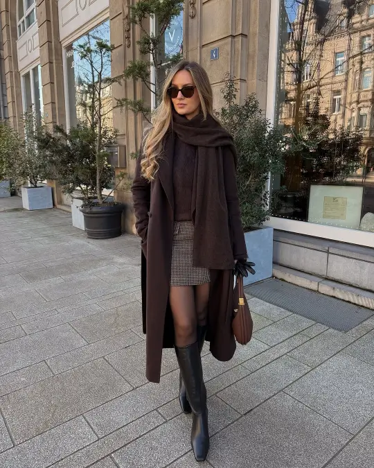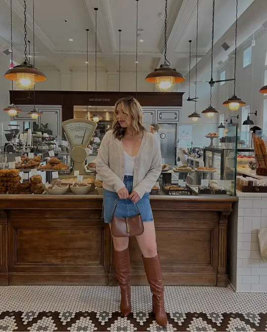This one’s great if you’re going for that casual-but-intentional look. A denim mini skirt, soft cardigan, and knee-high boots strike the perfect balance between relaxed and stylish. It’s an easy formula that always looks good — no overthinking required.