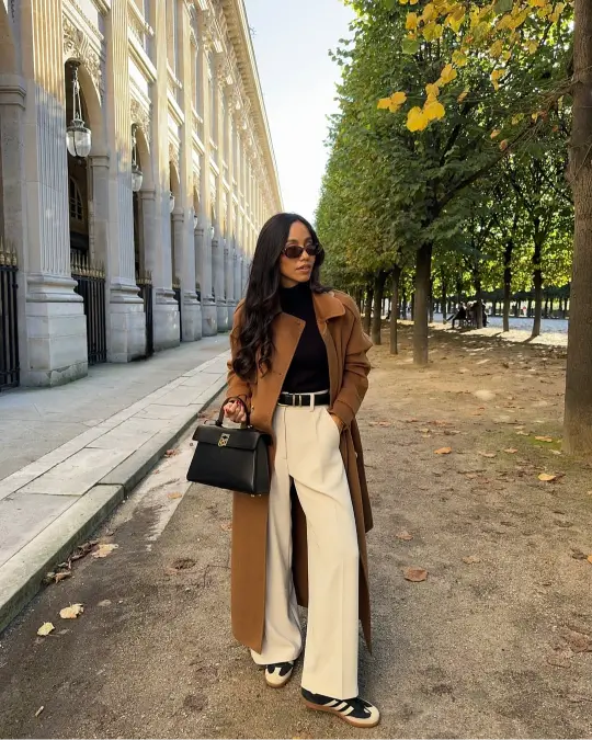 Trust me on this one — wide-leg trousers in a neutral fall shade like beige or camel are an underrated Thanksgiving gem. They’re comfy like sweatpants but look way more elevated. Tuck in a fitted knit, throw on some gold jewelry, and you’ve got the chicest outfit at the table.