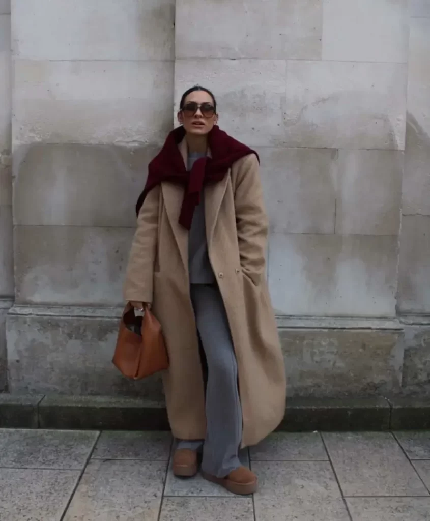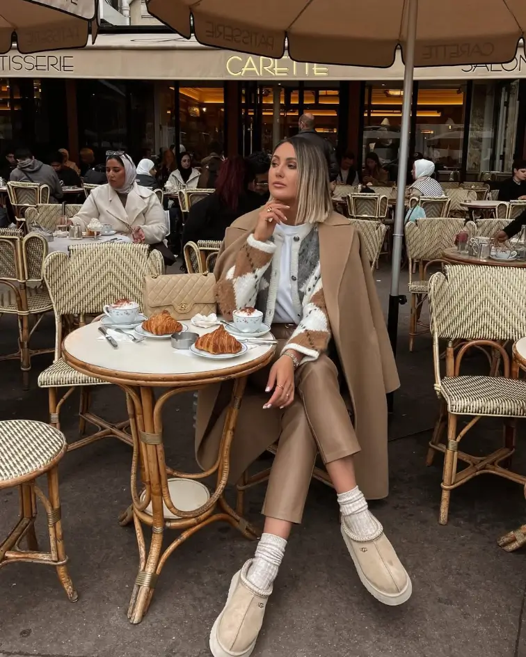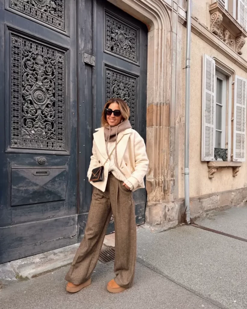 Wool trousers give off a sophisticated vibe, and when paired with Uggs, they stay practical and cozy. This combo works great for a more polished look without sacrificing comfort. Whether you’re at a casual work meeting or meeting friends for coffee, you’ll look elegant while staying warm.
