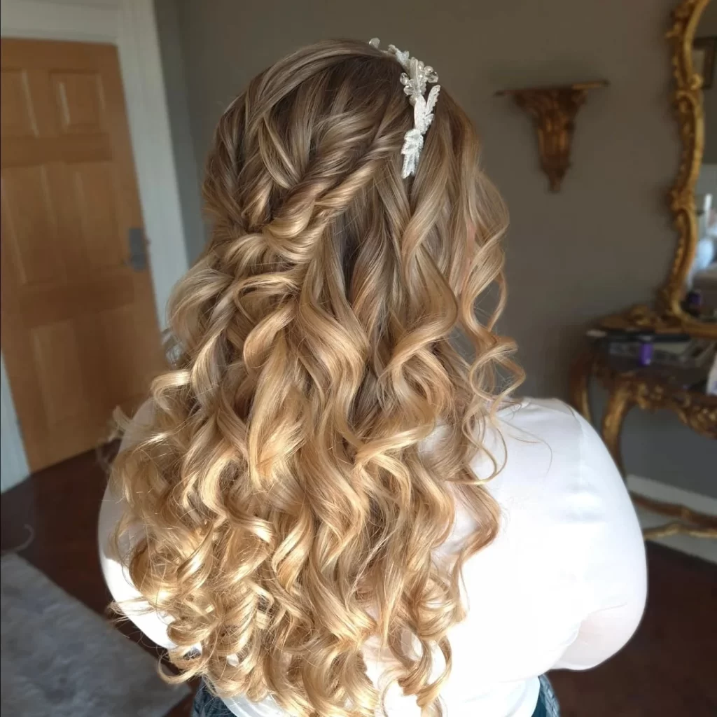 This braided half-up style feels relaxed and romantic. The braid adds structure, while loose waves keep things soft and dreamy. I love this look for garden or beach weddings. It gives effortless beauty vibes all day long.
