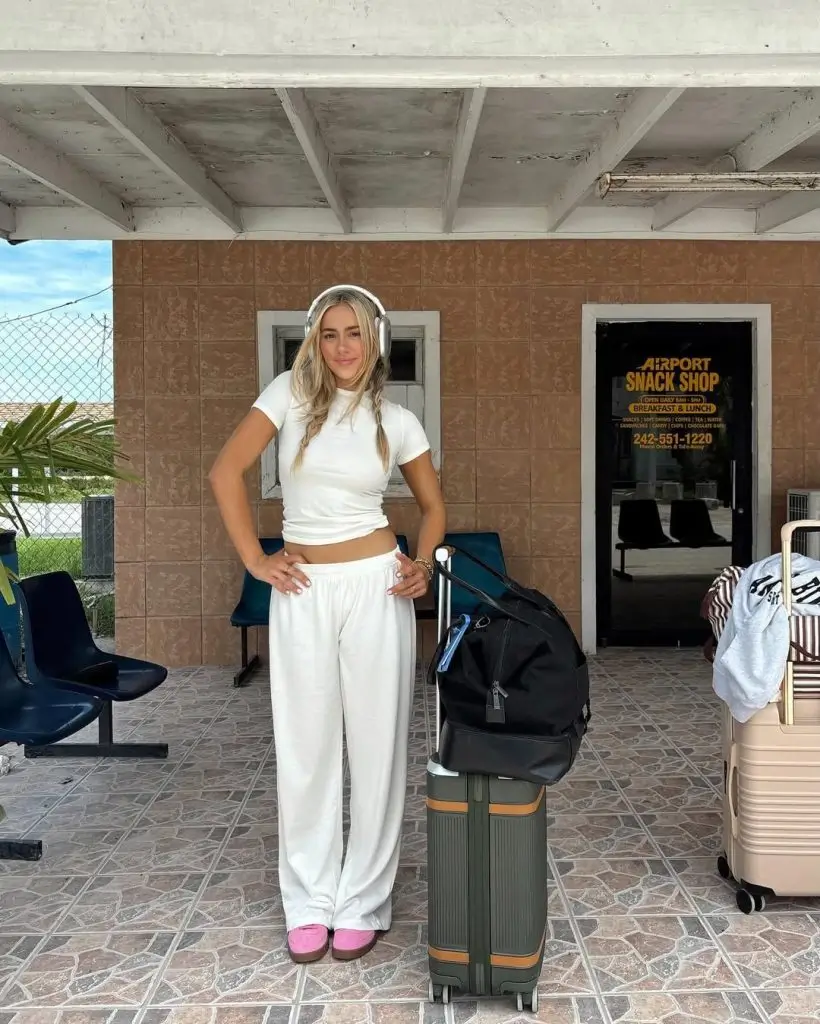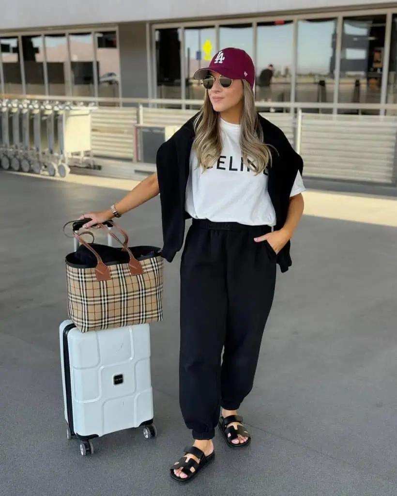 Athleisure is perfect for moving fast. Pair a cropped tank or fitted tee with light joggers, clean sneakers, and a baseball cap. Drape a sweatshirt on your shoulders for quick warmth. This Airport outfit stretches, hides wrinkles, and still looks sharp in photos.