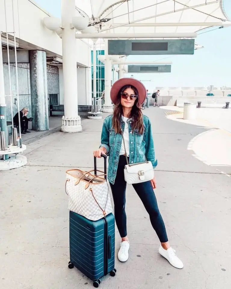 Going somewhere sunny? Try denim shorts, a breezy half-zip or light hoodie, and slip-on sneakers. Keep colors soft for a calm, beachy vibe. This Airport outfit gives you airflow outside and enough coverage inside the plane. A roomy tote holds sunscreen, a book, and a scarf for extra warmth.