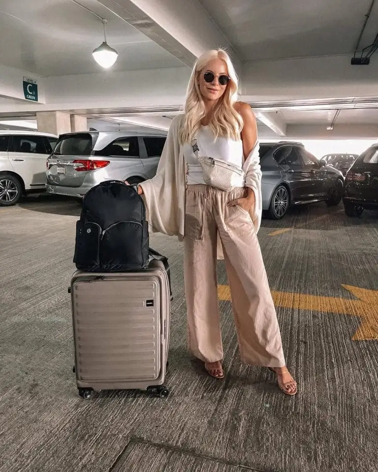 Linen keeps you cool and looks chic. Try relaxed linen trousers, a simple tank, and a floaty overshirt with a belt bag for hands-free travel. Finish the Airport outfit with comfortable slides or minimal sneakers. Neutral colors make mixing and matching easy for the rest of your trip.