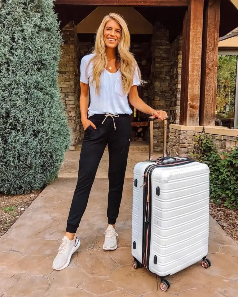 Want sweatpants comfort without the sloppy look? Wear tapered joggers, a relaxed V-neck tee, and clean trainers. Add a simple necklace and a crossbody bag to polish the Airport outfit. Pick joggers with zipper pockets so nothing falls out at security.