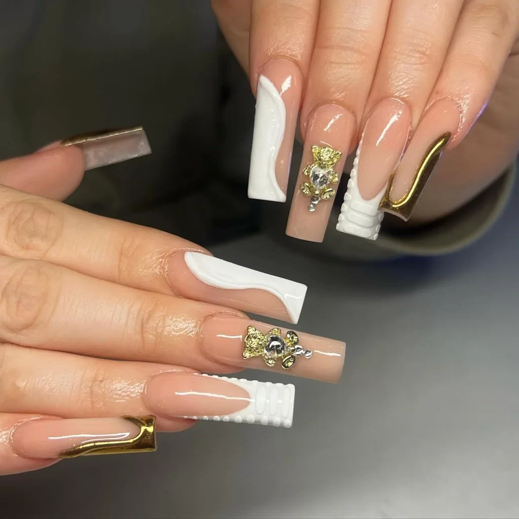 This style takes the classic French manicure and gives it a glow-up. Instead of flat tips, the nails have a sculpted shape that looks super refined. I love how the white tips stay clean while soft gold accents quietly steal the show. This White and Gold Nail look feels perfect for weddings or big events where you want timeless beauty with a modern edge.
