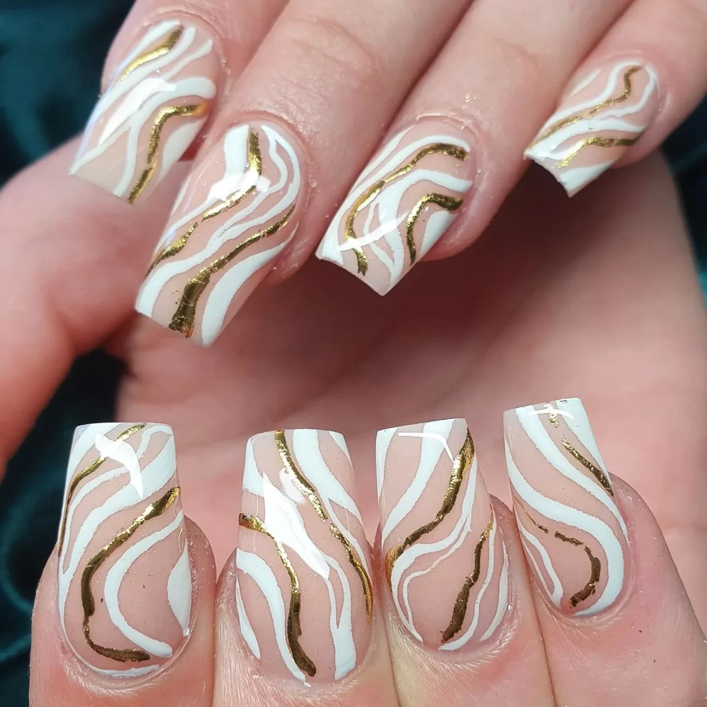 Golden wave designs add movement and personality to your nails. Instead of harsh lines, the gold flows gently across the white base. This White and Gold Nail style feels artsy but still wearable. It’s great if you want something a little creative without going full abstract art mode.