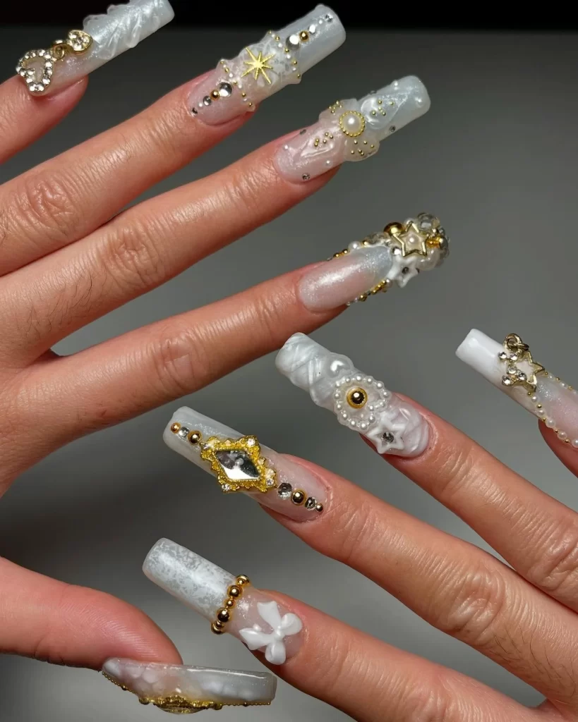 White and Gold Nail Starry Glam Look