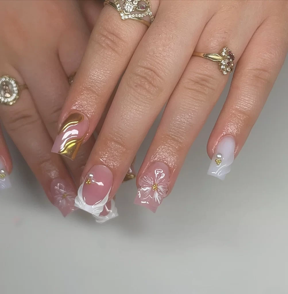 If you like soft, romantic designs, this one feels like a win. White and Gold Nail floral styles mix a creamy white base with delicate gold flower details. The result looks dreamy without feeling childish. I always recommend this look for spring or daytime events because it feels fresh, light, and pretty without trying too hard.