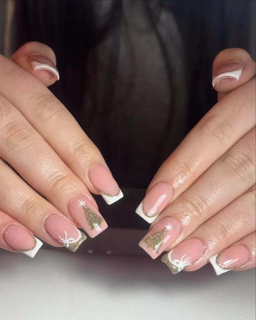 This one screams cozy season vibes. Think white French tips with subtle gold details inspired by holiday trees. The White and Gold Nail look feels festive but not cheesy, which is honestly hard to achieve. It’s perfect for winter gatherings when you want seasonal nails that still feel elegant.